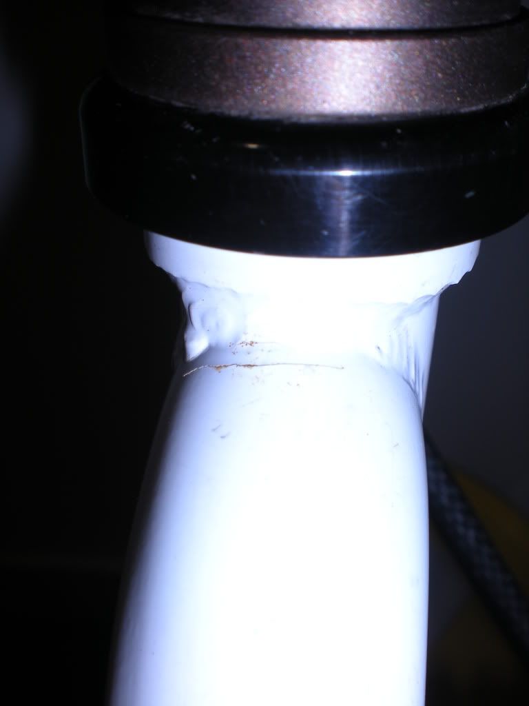 After cleaning my bike yesterday I found a crack in the top of my rigid forks. I'm a little worried to ride it, as it is about 3mm or so away from the welds, and so is at the Heat Affected Zone (look at me with the technical terms 🙂 - part of my dissertation is on this). Hence I suspect it is an actual crack rather than just in the paint from flexing. I haven't ridden on it and don't plan to in its current state.