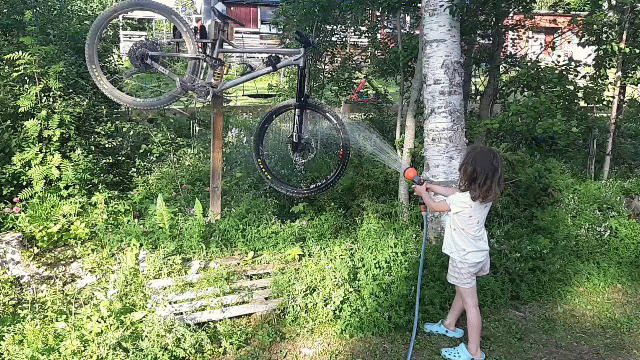 For the heavy e-bike there are two small flagstones at just the right distance apart set into the bed amongst the flowers, that it can sit there and be washed, leaning against the post..