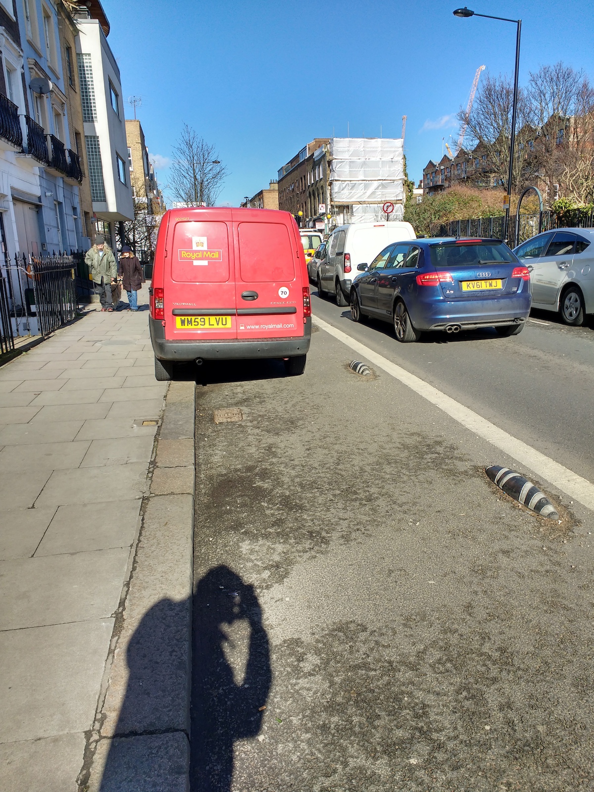 For a 700m or so stretch theres a parking restriction in peak hours but outside of this the signs say you can legally park, the cycle lane is black regular tarmac here and the line marking it on the road surface is solid