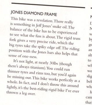 thegreatape. even the diamond and unicrown has fantastic geometry and designed as a rigid bike to work with jeff bars, with no compromises for boingy bits. I had the diamond and unicrown and it was brilliant, miles better than other "similar" steel bikes that i've ridden and or owned like karate monkey,one one, niner, swift etc...only sold it to upgrade to a spaceframe,which is even more Jones in its ride.
