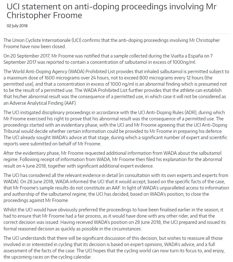 The UCI has considered all the relevant evidence in detail (in consultation with its own experts and experts from WADA). On 28 June 2018, WADA informed the UCI that it would accept, based on the specific facts of the case, that Mr Froome’s sample results do not constitute an AAF. In light of WADA’s unparalleled access to information and authorship of the salbutamol regime, the UCI has decided, based on WADA’s position, to close the proceedings against Mr Froome.