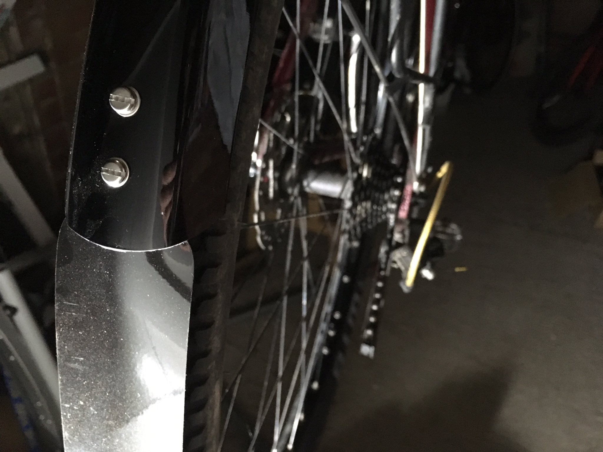 - If you're riding off-road you may have a problem with back end of the front guard swaying and catching the tyre. (Especially so on one of my bikes where I've mounted the stays to lowrider bosses instead of near the dropouts.) It can help to reposition the lower stay and perhaps even cut the guard shorter, if you value off-roadability over dry feet. Some guards have positionable stays, but it's easy to drill out the rivets on SKS guards and reposition them if need be (although it leaves you with two holes: you can either cover them with tape or use them to affix a flap).