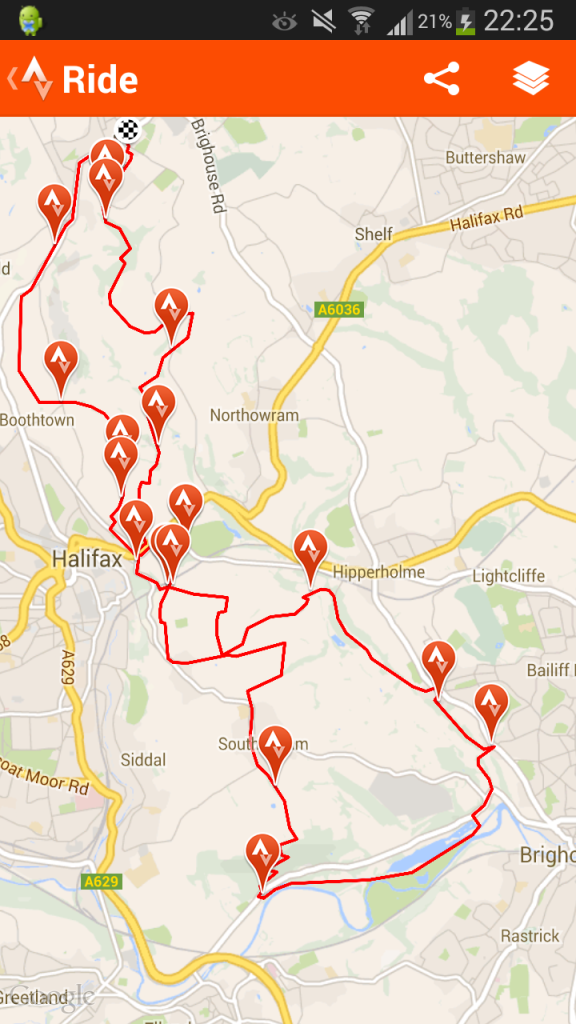 It starts at the train station, up over to Shibden, descent to ski slope, Shibden dale, over to Shelf, royds Hall, Norwood Green, to Hipperholme then beacon Hill and back to the station