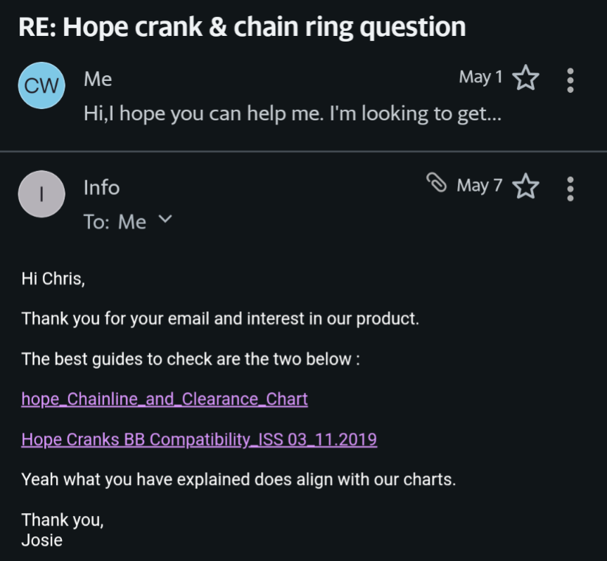 I've been struggling with chain line since fitting a Hope crank and BB. They haven't been very helpful to be honest. I managed a couple of single sentence responses. They didn't even send me the links posted above.
