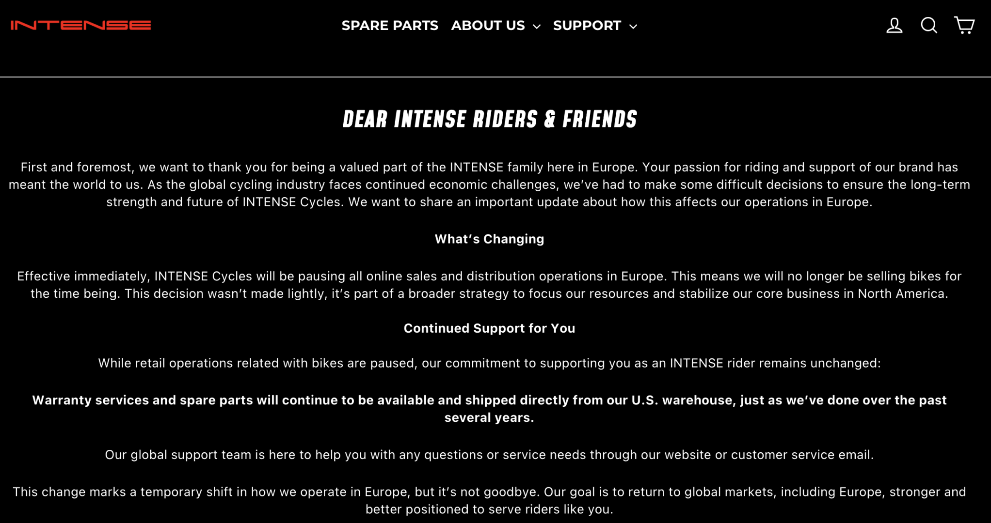Not sure if this has been mentioned yet.... but noticed yesterday that all European sales of Intense bikes have been withdrawn. They are supporting from a warranty or spares perspective (out of an Austrian HQ) - but now only concentrating on the North American market.