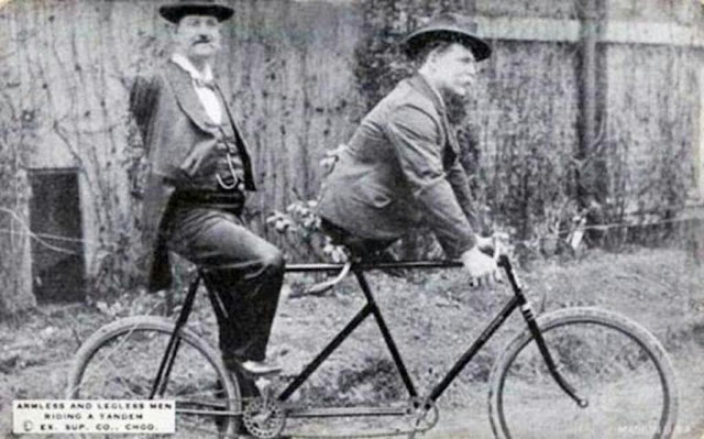 Charles B. Tripp, the armless man and Eli Bowen, the legless man, riding a tandem. ca. 1890s. While the pair posed for promotional photographs one of them spotted a tandem bicycle. In no time at all the two gents not only mounted the bicycle-built-for-two, but rode off together laughing as boys would. The photographer quickly snapped the pair mid-ride and the resulting surreal photograph still draws perplexed smiles.