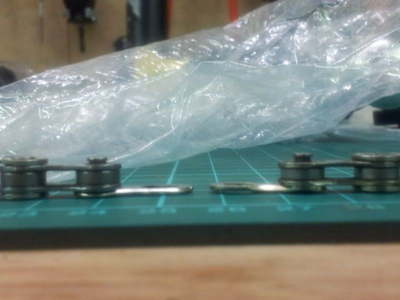 New chain on the left with half a power-link in, old chain on the right. For me there doesn't seem to be enough of the pin showing through and the links seem thicker....(or is it me being thicker??)