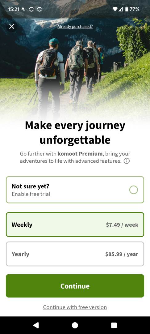 Oh look, it's just happened again....I just click the "use free version" and carry on with my route planning though I didn't notice the "Already purchased?" link - so I may try that next time as this begging screen is annoying. That weekly pricing is insane!
