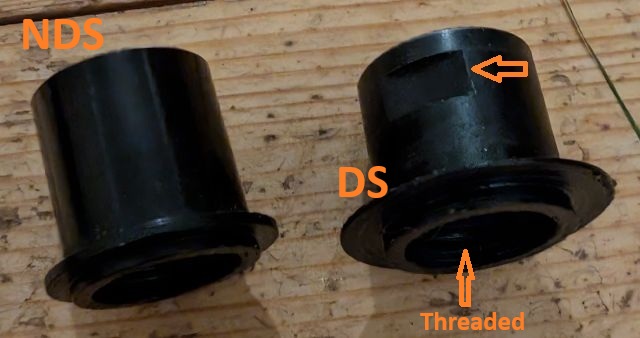 - Non-drive side is push on with an o-ring (note distinctive cut out in axle to help undo DS cap)