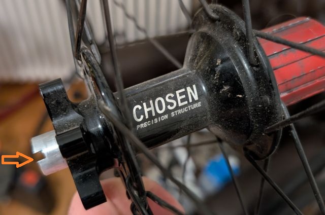 I have a wheel set with this rear chosen hub (Raleigh RSP with Alex rims draw 1.9 rim). It is currently 12mm but I'd like to use it on a QR frame. Does anyone recognise the design enough to be able to recommend an adapter set that will fit. Search has revealed the Sun Ringle, Stans and Progress (among others) rebrand chosen hubs.