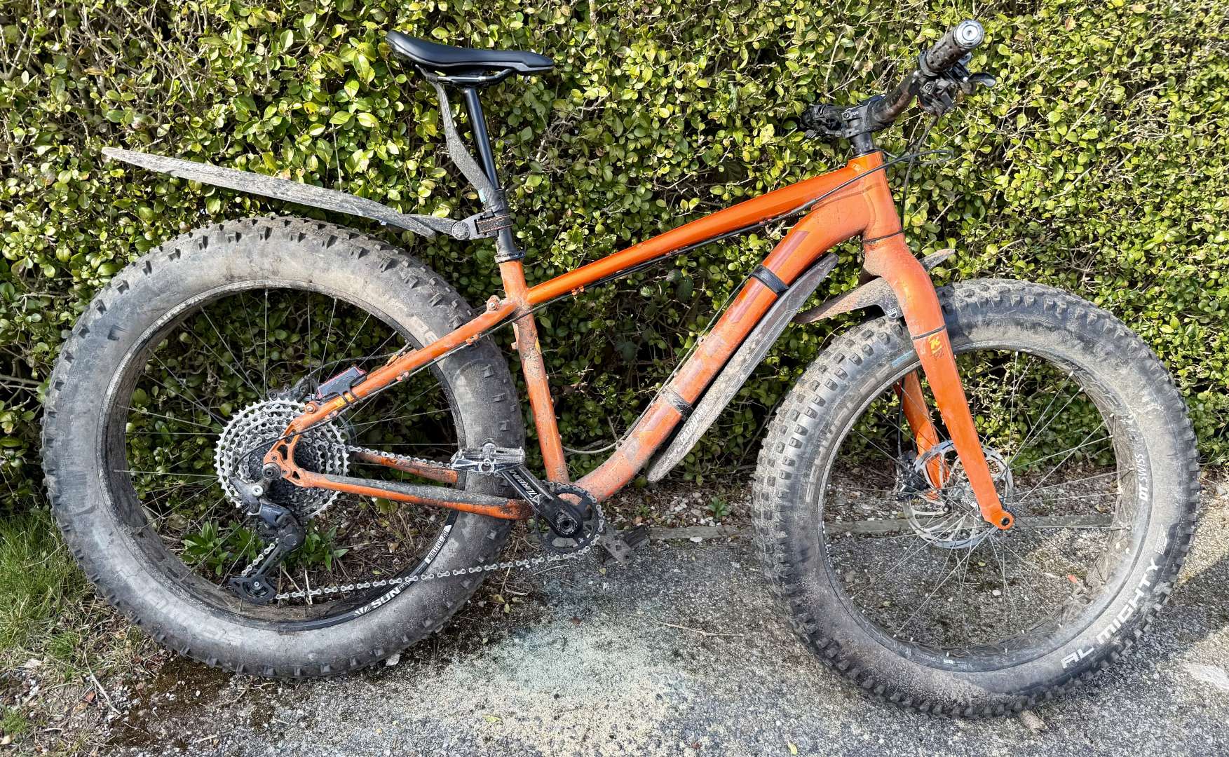 Wheels - DT Swiss or KT/Sun Ringlé, according to tyre needs, both light and easy to maintain. Tyres vary according to conditions but both Schwalbe, the bombproof, light and grippy 4.8 Jumbo Jim or/and the (heavy) Al Mighty. Sometimes tubeless, sometimes tubed and filled with slime.