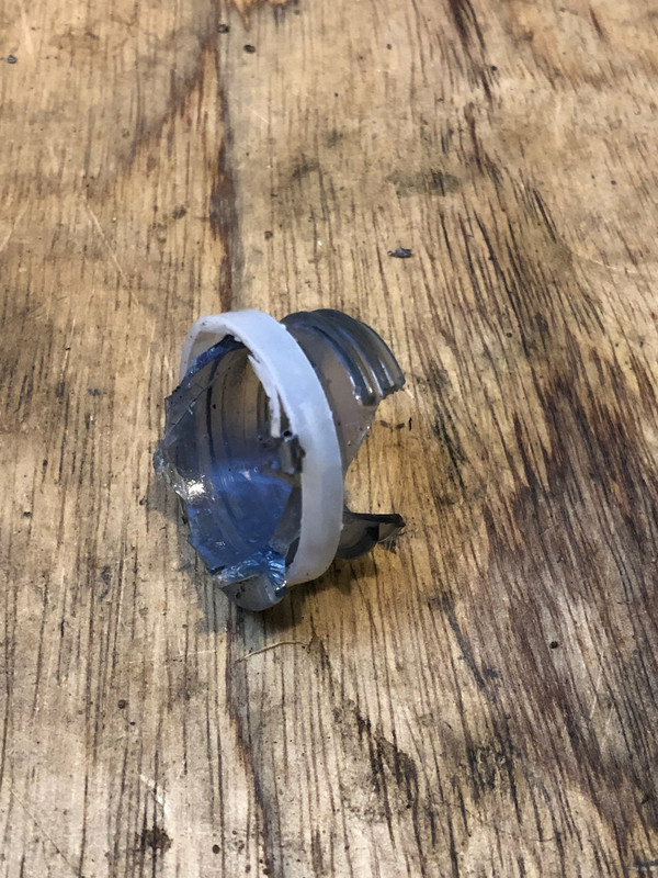 I've been living in fear of my ghetto 9p tubeless inflator exploding ever since I made it. There's a lot of stored energy and I always wondered what would happen if it went boom. But it's seated numerous tyres over the last decade, so it's had a good life. Anyway, today it started slowly leaking air due to a tiny crack in the cap, so I couldn't get it above 100psi. I was grateful it hadn't exploded so I popped to the shop to get a new bottle (for the record, a Co-op sparkling mineral water bottle for 49p).
