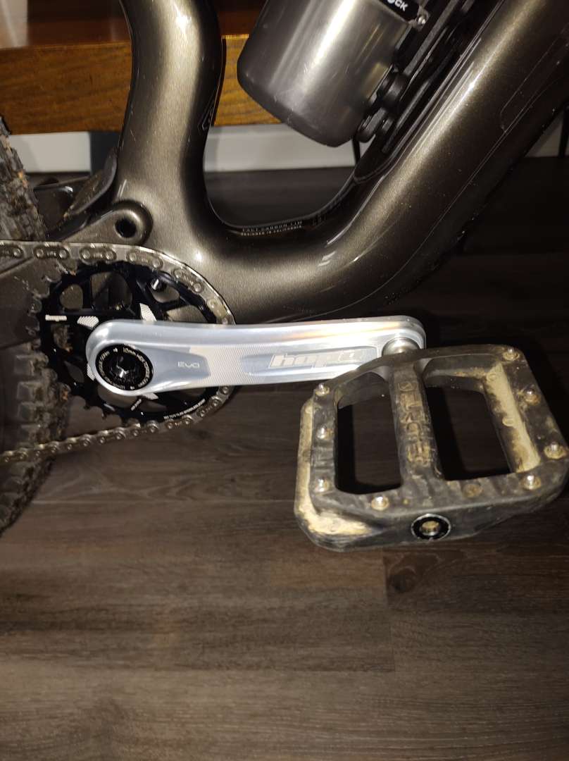 The BB is pretty low on it and after having a few pedal strikes on the test I went for a shorter crank. Hope 155 mm and lowered the gearing from a 32 to a 30.