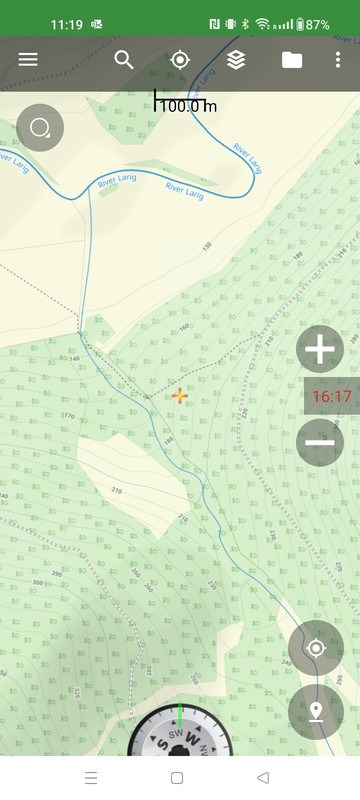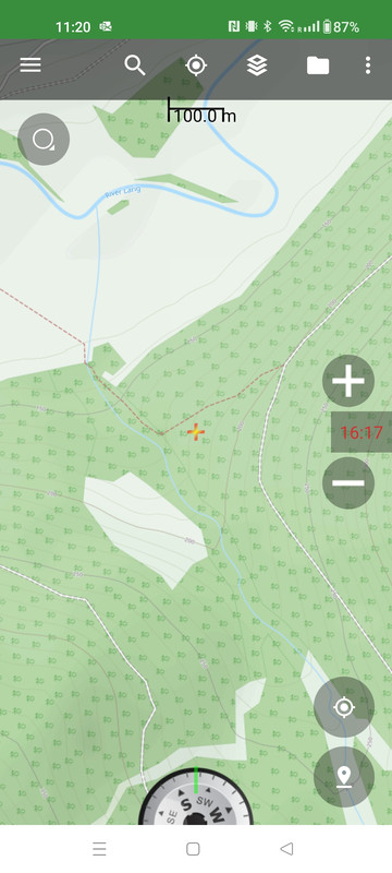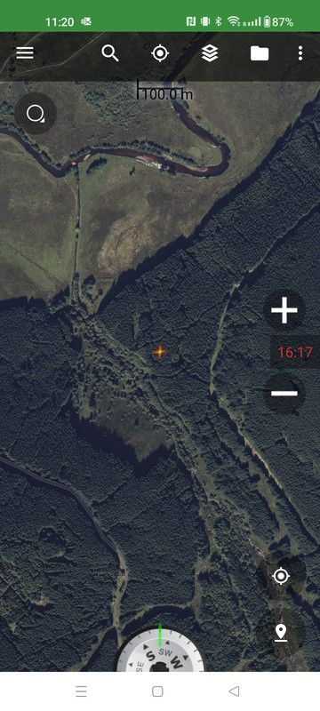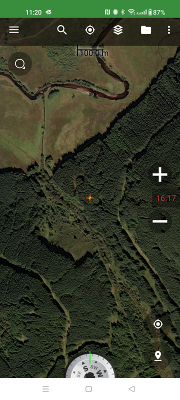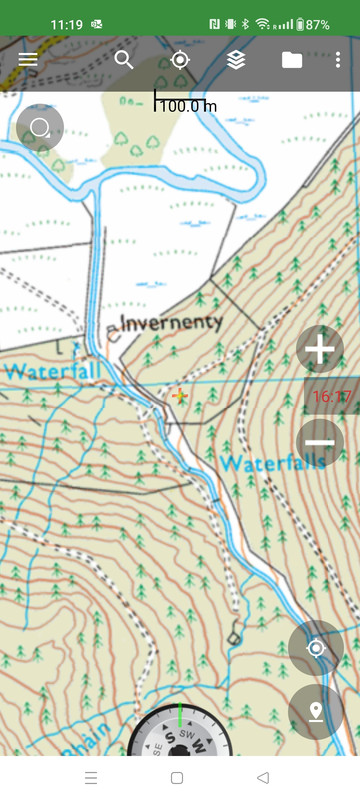 And then the daddy, OS map from Bing (can't seem to access the OS map on my phone. This actually shows the trail carrying across the stream higher up and then the path heading NW on the west bank. I may look into updating the OSM.