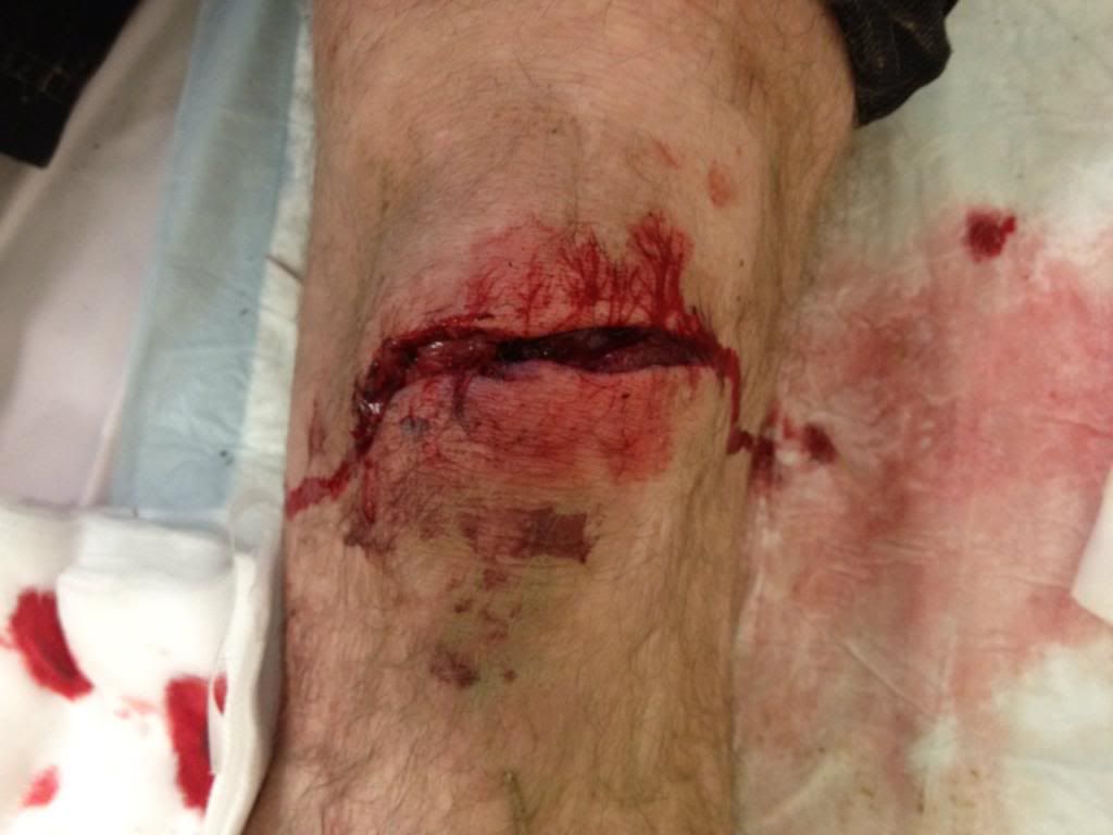 I remember a few years ago came across a guy on Spooky Woods that had come up short and done something similar but to both knees- one was all the way open, and the other was similar to yours- ended up helping carry him down on a scoop after I'd cleaned him up a bit and dressed them both..