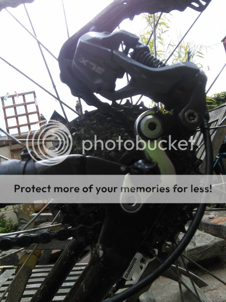 OK, finished your cuppa? Back to that derailleur. Check the position of the jockey wheel over the small sprocket. It should be a tiny, tiny bit short of lining up directly with the sprocket. If it's directly in line with it, or past it (so, nearer the derailleur body) adjust the 'H' screw. Now manually push the derailleur over in the other direction towards the large sprocket. Hold it there and see if the jockey wheel lines up with the large sprocket. Adjust the 'L' screw till it does. Let the mech drop back to the small sprocket. That's your derailleur limits set.