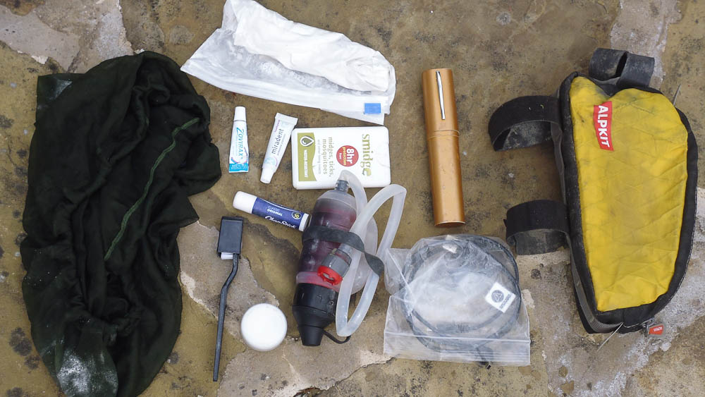 Actually there's two stem cell bags. They are for trail food, flapjack, chocolate and the like. Only take one 750ml water bottle. An MSR Trailshot water filter goes in the Fuel Pod along with the glasses etc. then if the water source might be dodgy I just filter water straight from it otherwise I just fill the bottle directly.This was the contents of the fuel pod for the Highland Trail this summer.