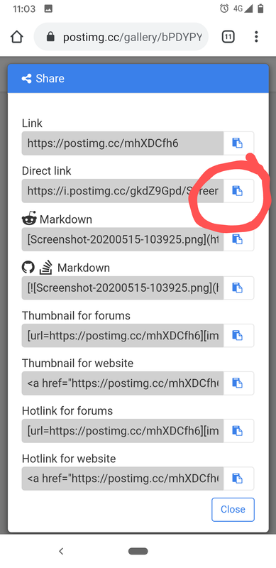 Tap that button. This will copy the address of that image to your clipboard. Once tapped, tap 'close' at the bottom to return to your uploaded images.