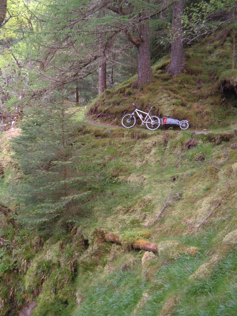 No trailer, 10kg Wingnut APS rucsac, 2.7ltr Ortlieb saddle bag, sleeping bag under the handlebars. This set up was pushing it, in future I'd plan for fewer days food or try hostelling or something, was just a little too heavy for real off road stuff.