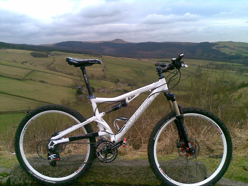 Syncros / Hope SP3 wheels with Panaracer Cinders, 100 - 130 mm RockShox Revelations (but never run much over 115mm), 27" Monkeylites, 90mm FSA stem, Hope Mono Minis with Goodridge hoses and floaty saw tooth rotors - 183 / 160mm, SRAM shifters, XT back end, RaceFace Evolve XC triple crank / Hope BB, CB Smarty pedals, SDG I-Beam post and Bel Air saddle, ODI lockons, Gore Ride-On cables.