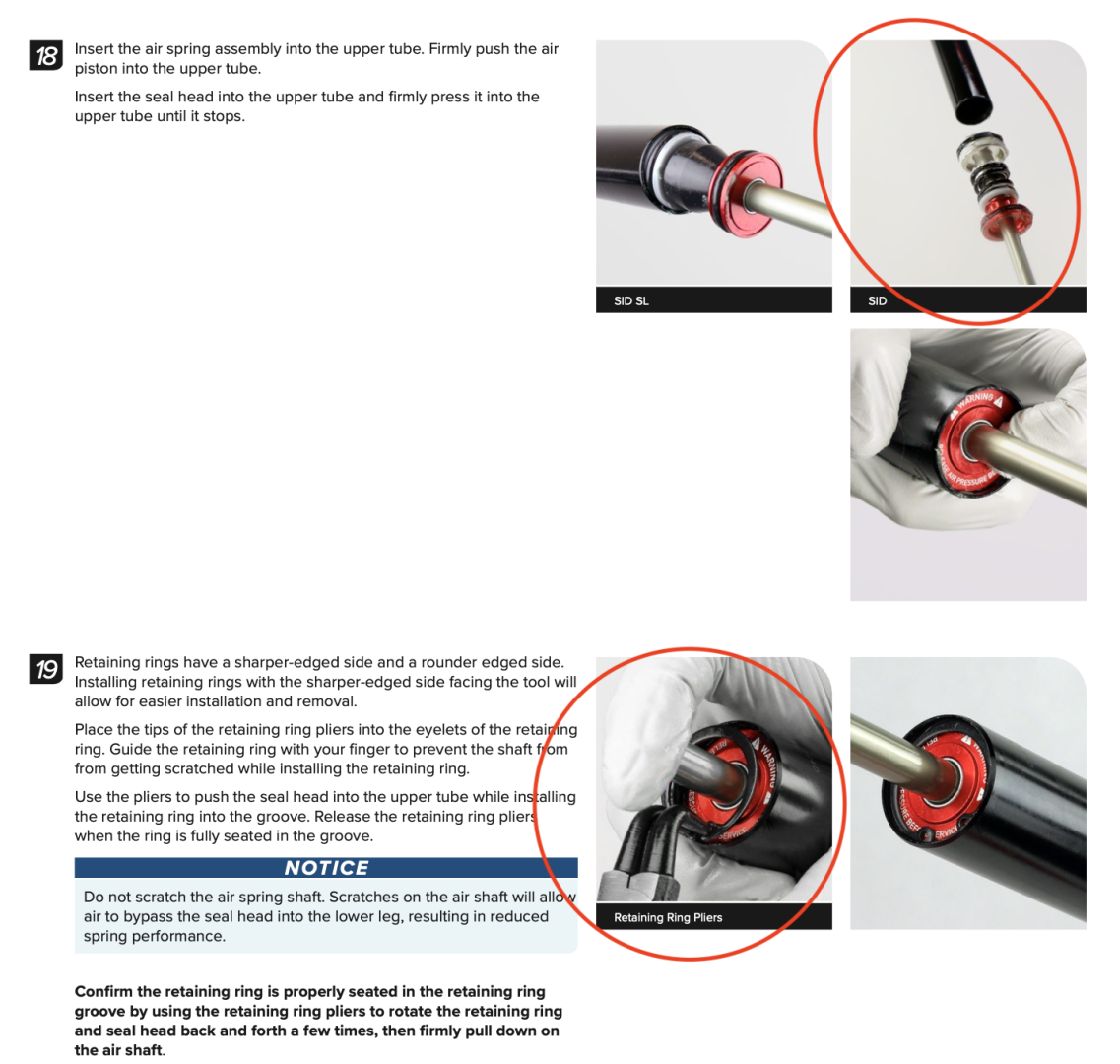 His is the newer SID with the Debonair+ air spring - the problem being is that the service manual suggests pushing the piston all the way in, to avoid scratching the air spring shaft when putting the circlip back - which is where the OP got stuck.
