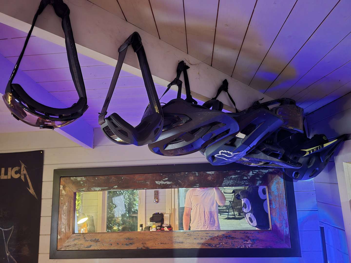 I had a bit of space in our utility room on the wall next to the boiler, and put up a metal IKEA pan rack from which metal S-hooks hang for helmets to hang on. Means they can air and are easily accessible.