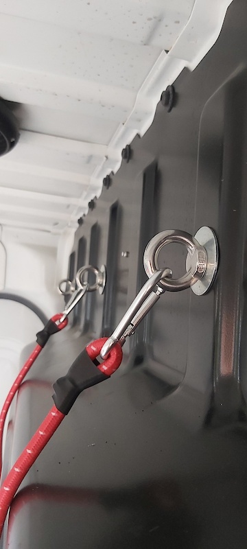 I put 3 rivnuts in the bulkhead and one behind each side door then screwed in the lifting hooks. So I've got lot of options for bungee cord locations no matter which selection of bikes I throw in. It takes seconds to strap them down tightly. No messing around with awful ratchet straps.
