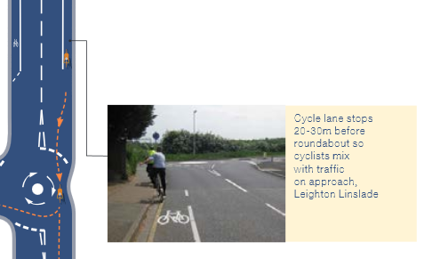 Bizarrely, their diagram to illustrate "good street design" shows that roads on which there was space for a cycle lanes should lose those lanes as they approach a roundabout which itself has no clear markings. This will generate conflict and danger just as it does at similar designs which have been tried in the Netherlands.