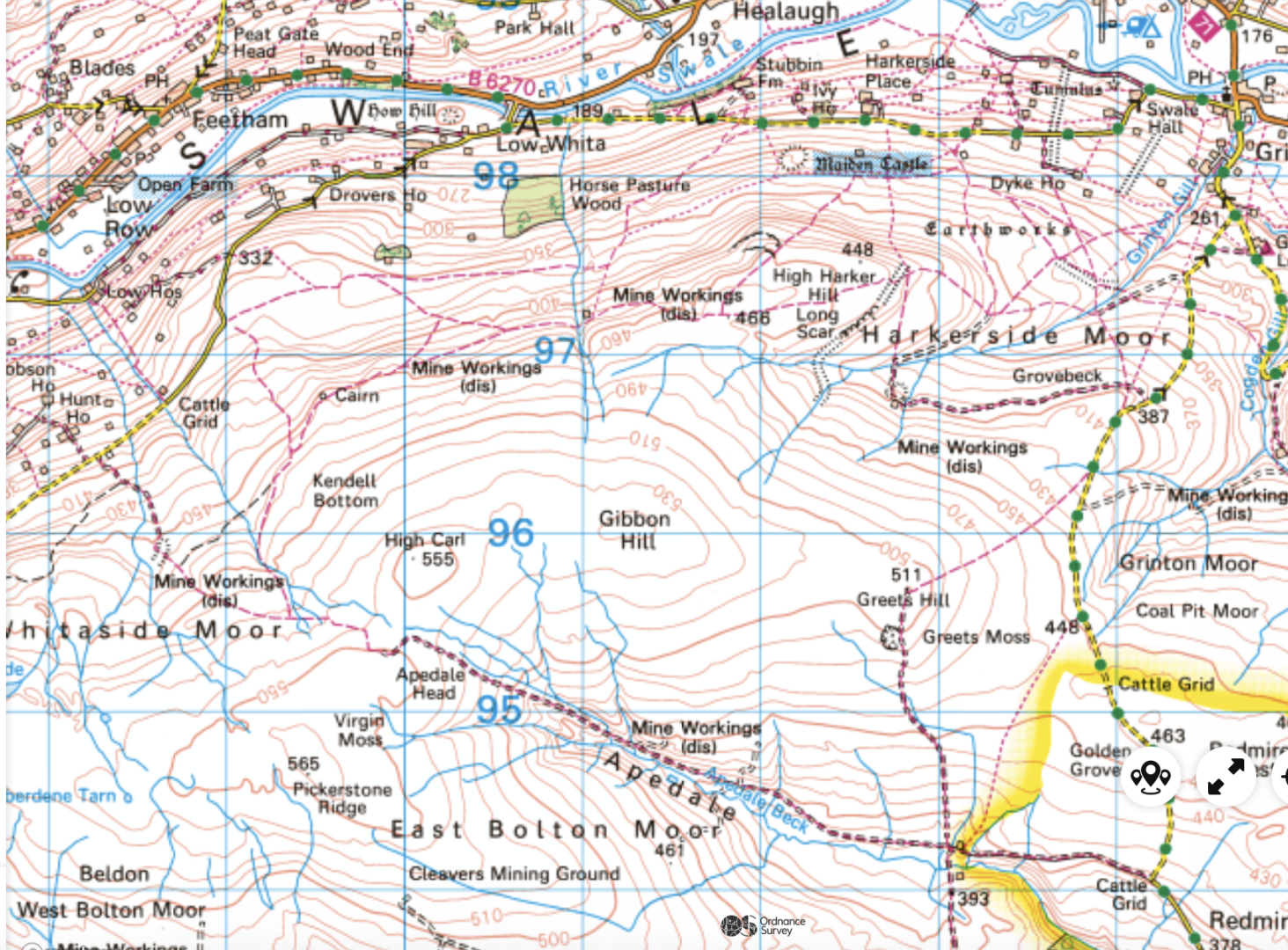 If you just want an out and back, find a parking spot as near to the cattle grid marked above - as you can see you start at about 400m, drop slightly, climb back up to 400 ish, but it doesn't start heading up properly until Apedale Beck splits about 2kms past the crossroads. The huts just off left next to the crossroads are normally open if you need somewhere out of the wind to have sandwiches etc. It can get chilly up there.