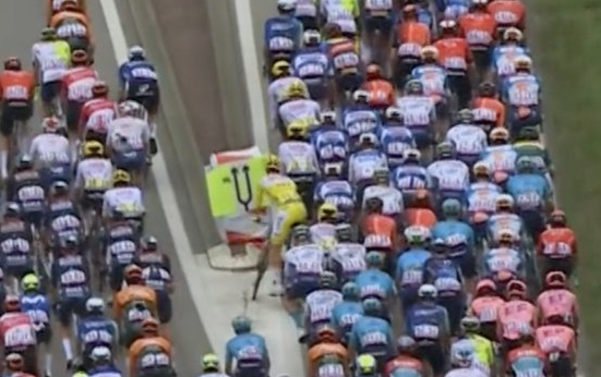 Sketchy as **** in that peloton now -Christophe Laporte down in a minor spill, Alexander Kristoff fell on the descent. Relatively calm and controlled at the moment, can't be long before it all lights up.