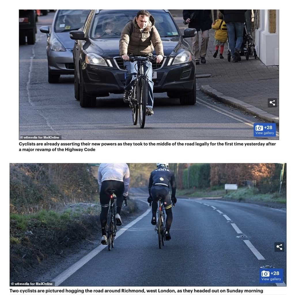 This "middle of the road" line is everywhere... Radio4 were using it in their news headlines. That DM example even shows a rider central in their lane (they could be coming up to a junction, or there's a pedestrian looking like they might step into the road, who knows) NOT the "middle of the road". There's a whole other lane there for overtaking if need be. Yes, it might be too busy to overtake at just that moment... but... the rider is in the correct lane... NOT the "middle of the road" as if about to turn right.