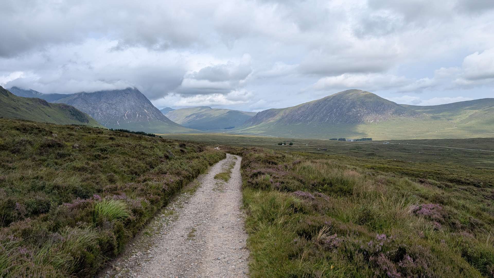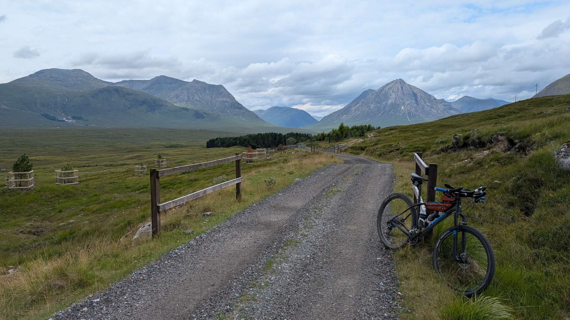 I happened upon a track that looped around the back of Beinn A'Chrulaiste, the hill oppostive Buachaille Etive Mor, along whose flanks the West Highland Way traverses before climbing the Devil's Staircase. As I had originally planned this as a gravel route, I didn't fancy the climb/push up the Devil's Staircase OR the rocky/drainage ditch-y descent down the other side, so a gravel bypass looked very appealing, especially since it linked with the Blackwater Dam and the looooooong gravel descent back down to Kinlochleven.