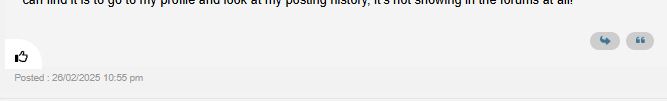 The thumbs up "like" for posts is a bit hard to use, not least because its hard to see that it worked, little difference between black and blue outline, if it were an option a solid blue would work better - posting seems better, this posted at 11:40 EDIT, appeared immediately