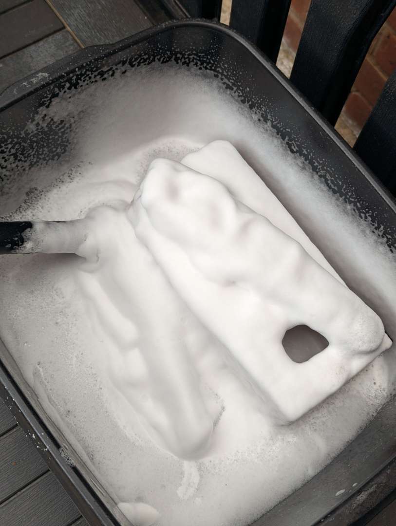I use drain cleaner instead of oven cleaner so I can see it working rather than guessing how long to leave the foam on.
