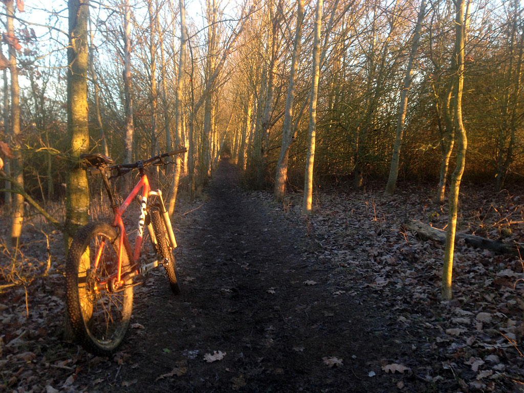 Sunday - 45miles on hard frozen dry trails, until last few miles when it had started to thaw. Mud clogged like mad has stripped some paint where its rubbed on chain stays. Pissed off.