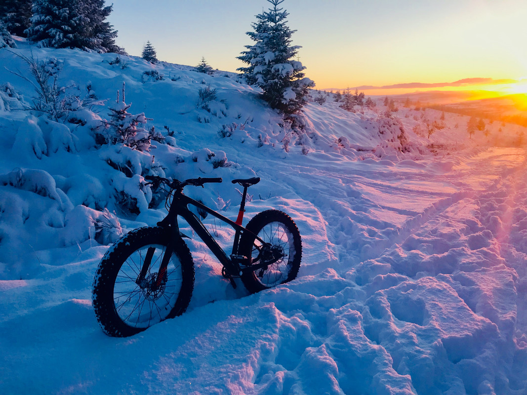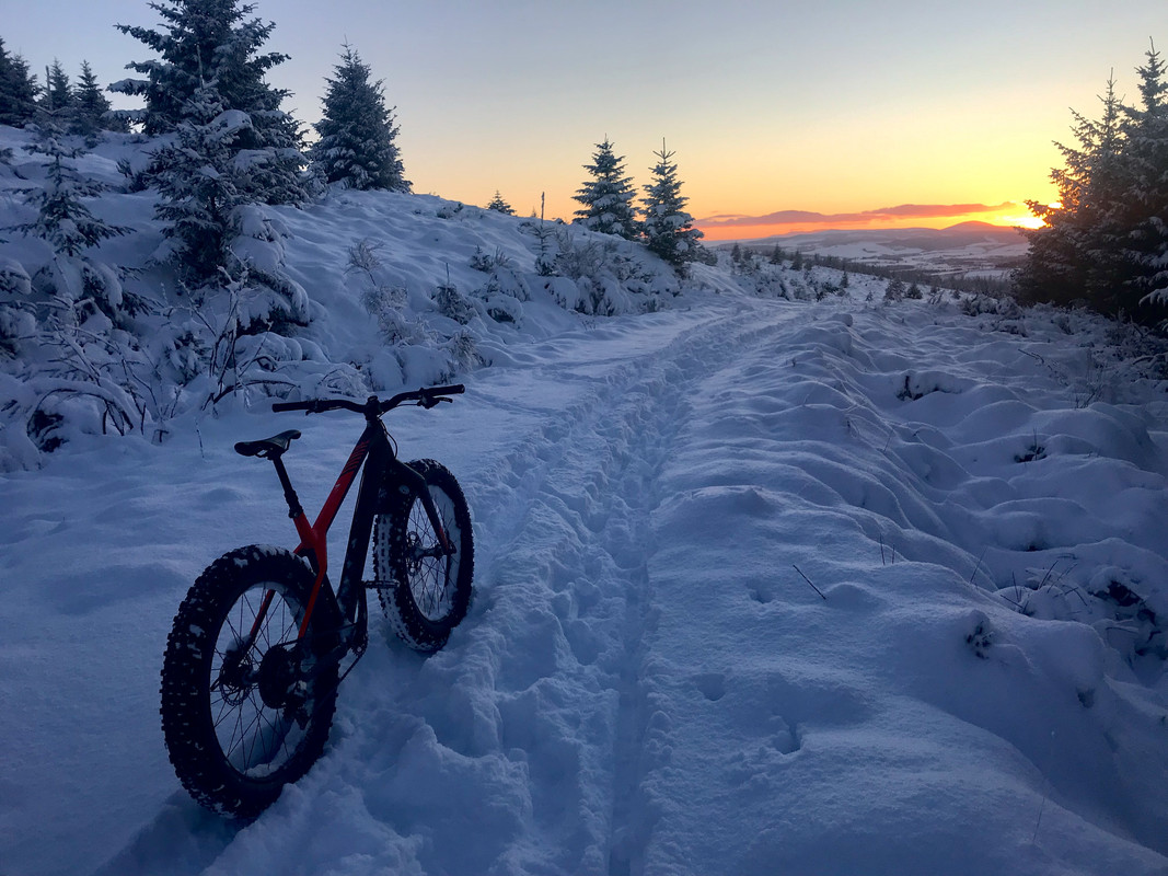@theotherjonv - riding in snow is all about tyre pressure (whether you are on a fat bike or not). We spent twenty or thirty minutes at the end of our ride messing around next to the car park on what is essentially flat ground letting more and more air out of our tyres to find the sweet spot.