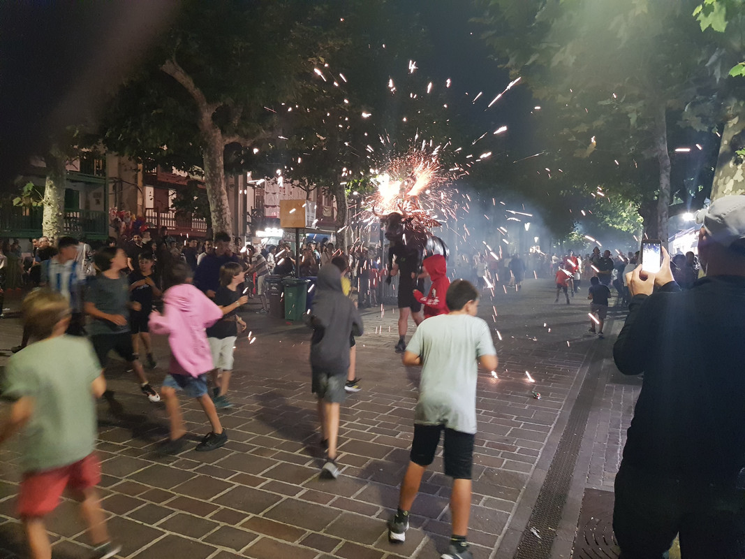 Last night they had a bull and child friendly version of running the bulls. A man with a papermache bull on his back with fireworks on the horns chasing kids around. Huge fun.