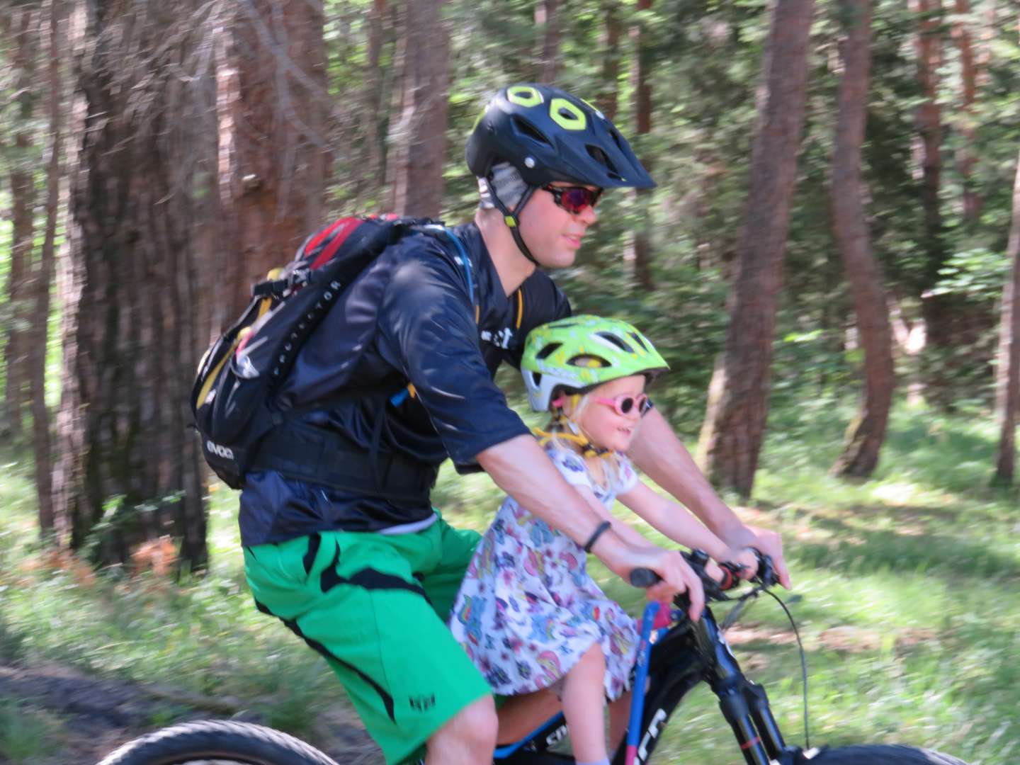 Used a weeride up until our lot tuned about 3, then had a MacRide seat until they could ride distance properly - took it to Morzine to muck about on the greens. By the end of the week it was a case of "Stand up Zoe, there's a jump!". Use flats, you'll ruin your knees with clips and you really don't want to fall over through forgetfulness. A little bit of roadie bar tape between the controls makes a macride / shotgun seat a much more pleasant thing for little fingers to use.
