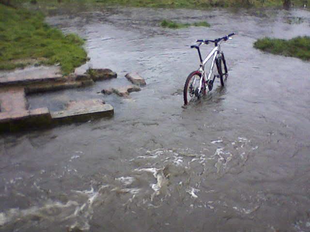 I got in from work about two o'clock this afternoon, and as it was slagging it down I decided to go out for a mad ride in t'woods. I even had the forsight to grab my old phone so I could take a couple of pictures. The quality of them isn't brilliant, but I think they show how wet it was.