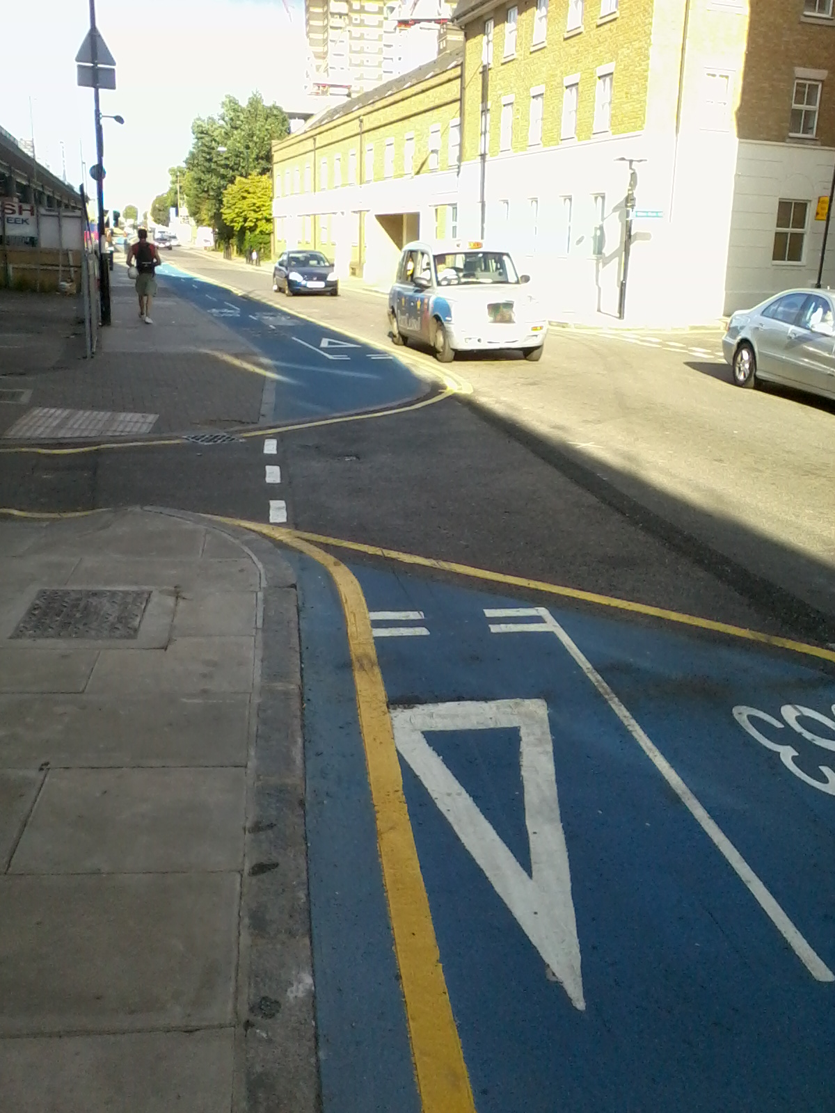 [i]TR: those are put there (with the highlighted bit past the traffic islands) to alert motorists to the fact that they can't pass a cyclist at that point, there isn't space to do so.[/i]