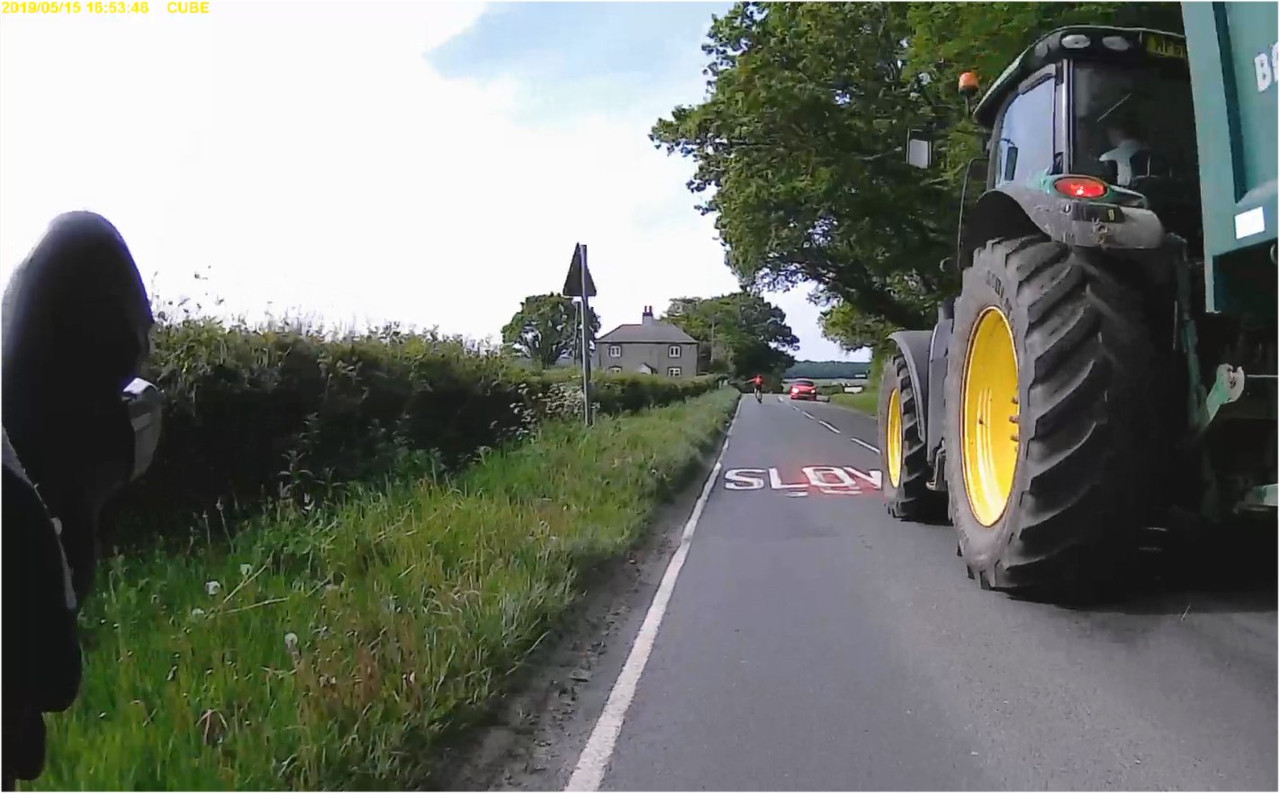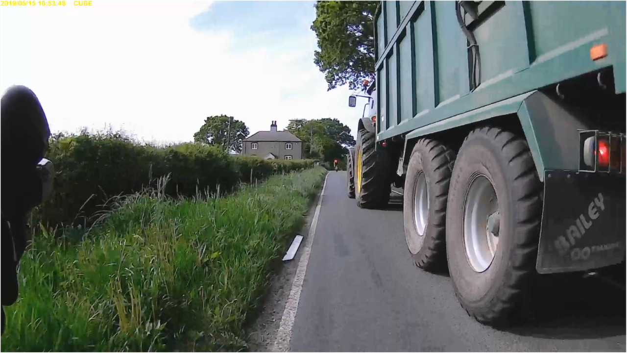 [i]I [/i]could see the car coming the other way. I was surprised that the actual TRACTOR had started to try to overtake me at that point (you can hear me grumble in the video, (well I can!)), THEN the bloody trailer comes into view and I'm shocked and hit the brakes and move over. At which point the swearing starts.