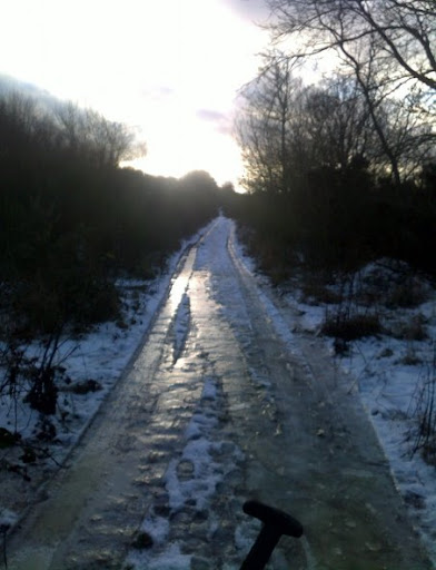 had an early morning single speed and sections that are usually gravel and rideable all year were 1/2" thik sheet ice, funny as hell but it made for some intersting hill climbing antics... power down on a frozen grassy bank/bermy bit, mince across ice vaguely aiming for anything with traction (leaves,tree roots, dead badger) as soon as the rear wheel doesn't spin out, sprint and aim for next bit of traction. Frozen horse poo is very grippy!