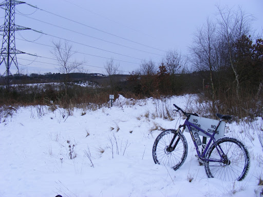 Yesterday was terrible on the minor roads that link the tracks up, sheets of thick ice meant it was bloody treacherous in places. I had a few spills and I'm feeling the effects today, pretty hard going too on the single speed. When the snow first came down a few days before Christmas it was great though! Here's a pic from that ride.