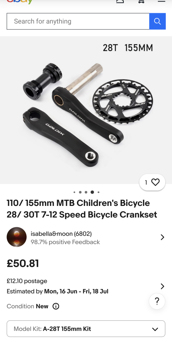 @tenacious_doug, 150mm Goldix cranks via Aliexpress on both mini-a11y's bikes. 24mm HT2-style axle and they they take a standard 3-bolt SRAM chainring so plenty of cheap options (28t SRAM steel N/W for us). Been in use >12mths inc 2 weeks in Les Arcs last summer. Even my eldest is still only about 50kg though so not exactly hard use.