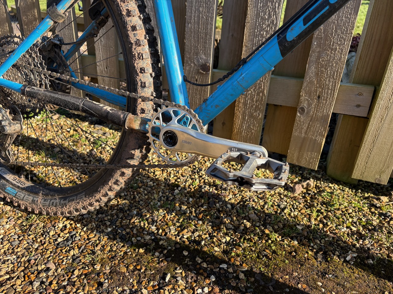 I've pointlessly upgraded the hardtail with alltheshiny(tm) cranks and chainring. DMR Axe 165mm with a Works chainring. Expect they'll be coloured in "winter brown" on Sunday.