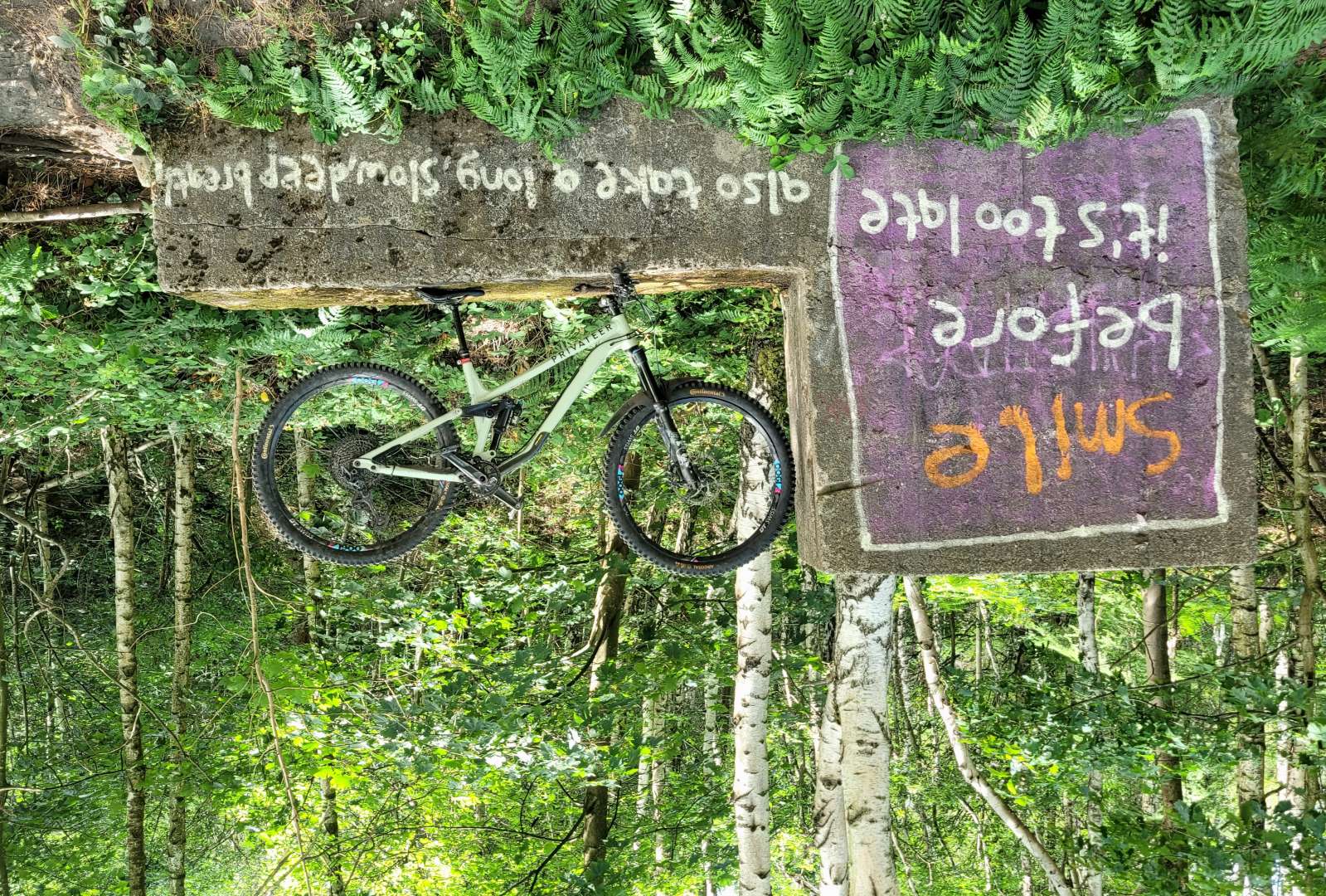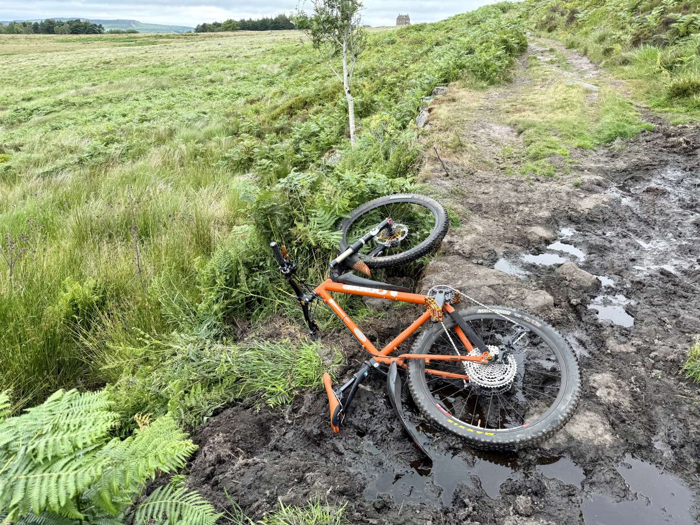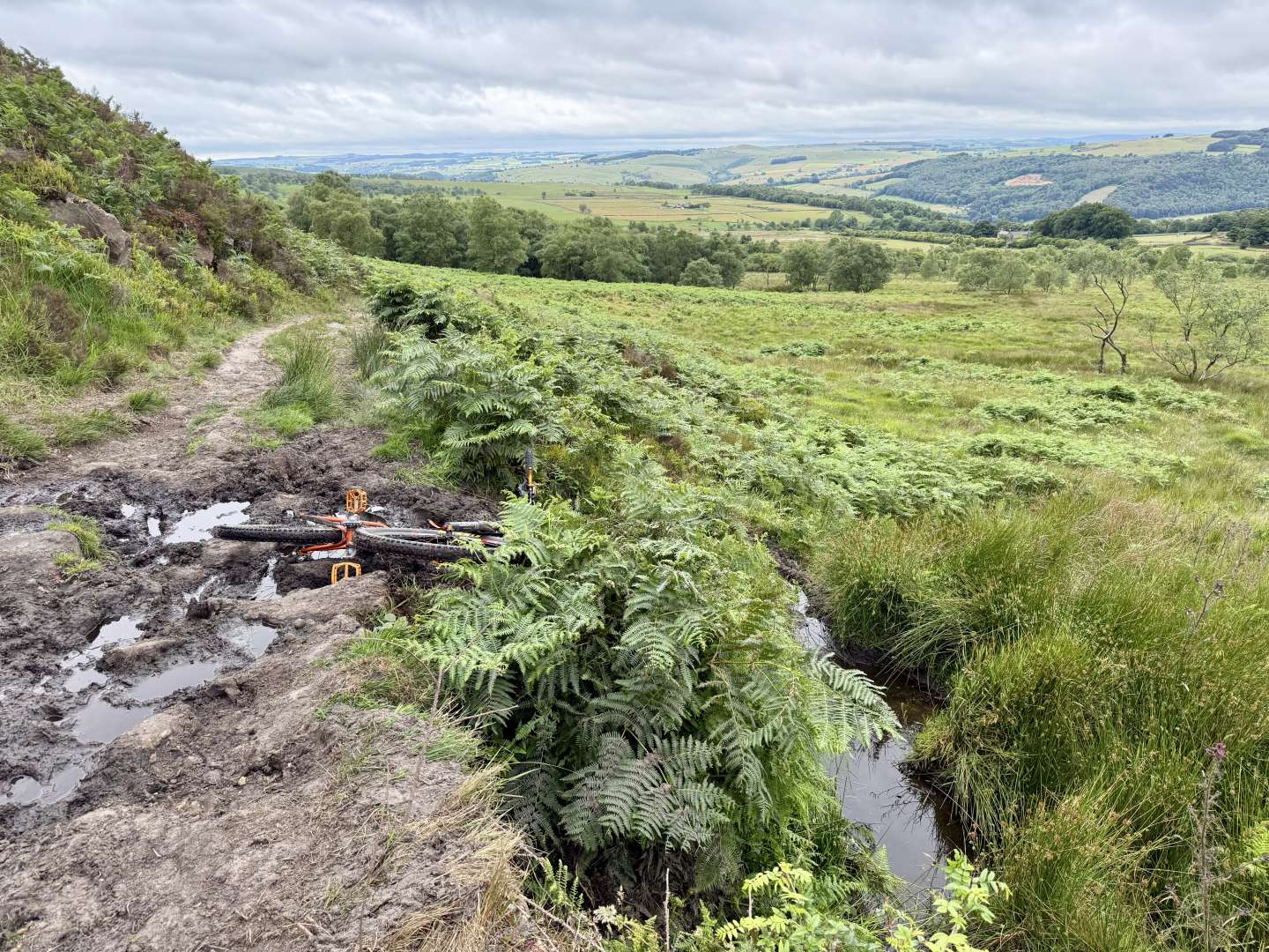 Lovely weather, cool, slight drizzle but always a headwind. Had a slow speed tumble as the pictures show down a 2m bank but stopped myself before the stream. Bonus!
