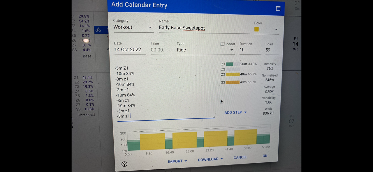 It’s also not true that you do more work at sweetspot. Let’s say you have an hour. With the Z2 method you can jump on and start pedalling at target power and just stop when your done. No pressing need to warm up or cool down. The interval becomes 1x60 at say, 76-78% ftp.