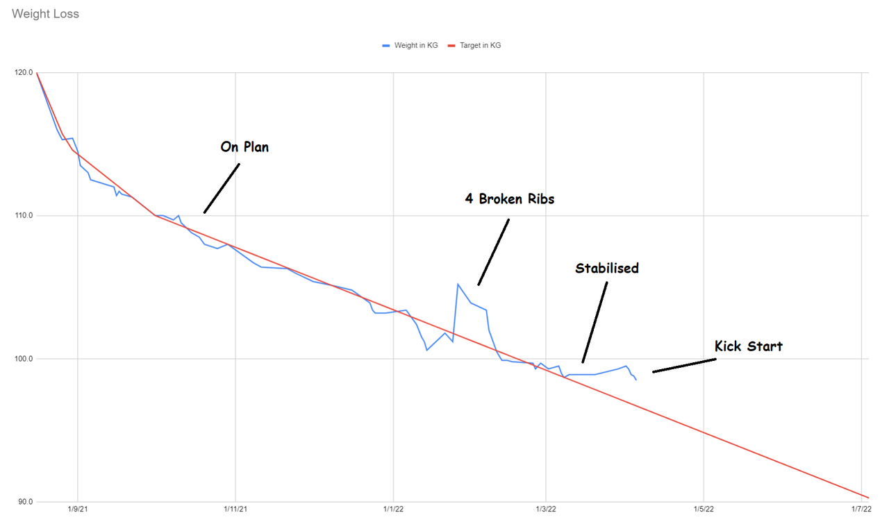 I believe that if I hadn't broken 4 ribs, which stopped almost all movement, I would have continued the 0.5KG per week loss for a little while longer. I know that my calorie consumption increased during recover through 'boredom eating'.