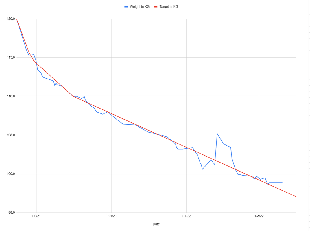 I had to keep adjusting the formula for the first couple of months as the rate of loss declined but it soon was running at a constant 0.5kg per week which made the maths easy.