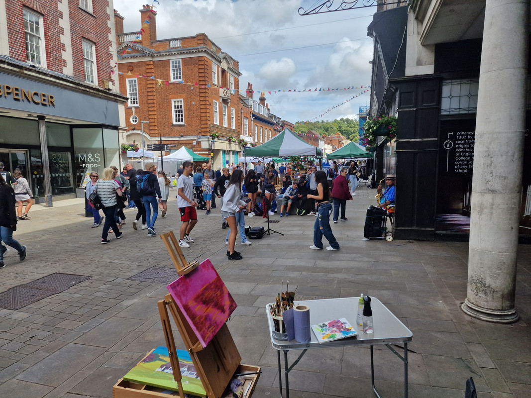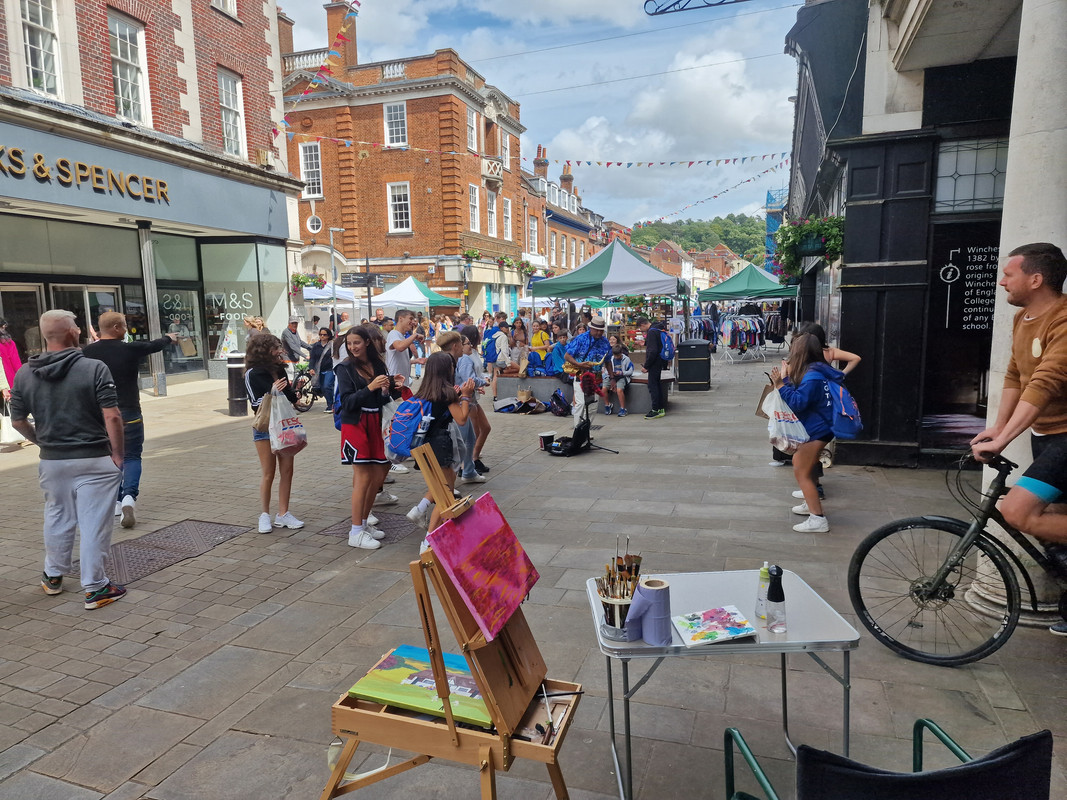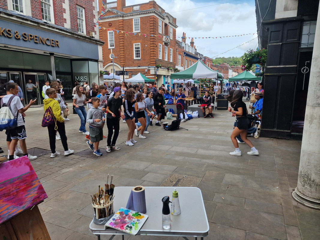 Two girls started dancing to the busker playing sax. Another girl tried to join but struggled to follow the moves so the first girls step forward and face her so she can see the moves. A teenage boy joins in and sudden=ly there are 20 of them dancing away. The kids in the crowd join in, even the local homeless join in.